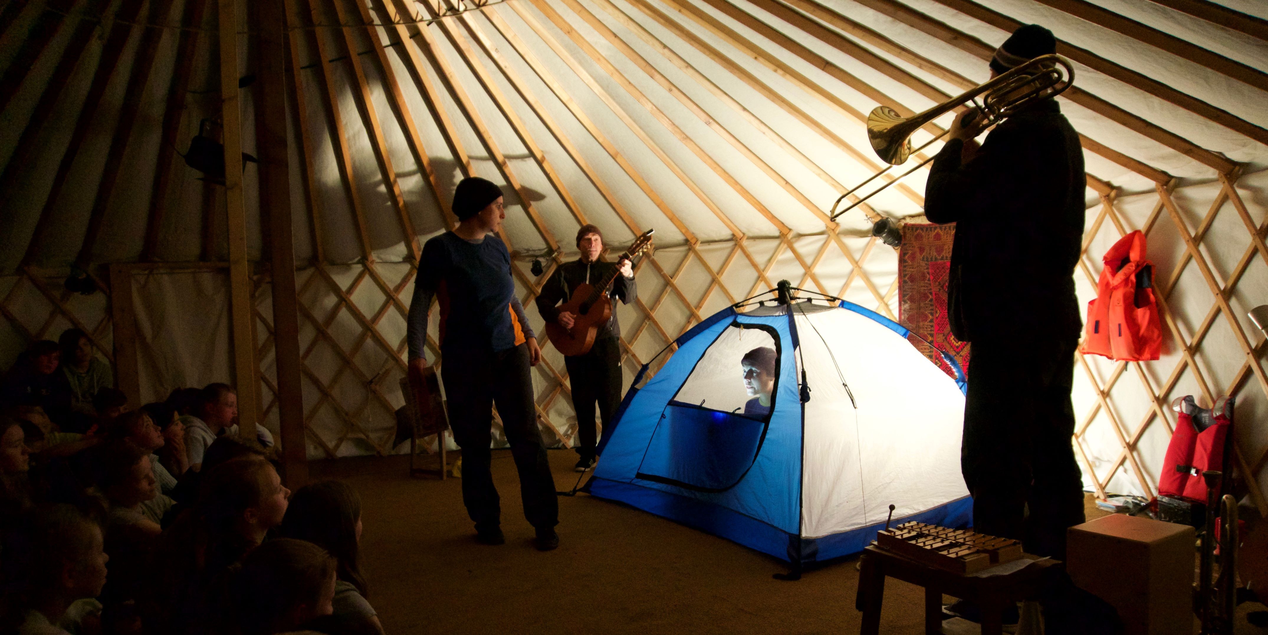 Eine Jurte auf der Theaterbühne! Darin genügend Platz für das Publikum und die Spielerinnen und Spieler. Auf engstem Raum entfaltet sich die Geschichte zweier Jungen aus Aleppo, die quer durch Europa nach Norwegen reisen. Vor dem Hintergrund ihrer Reise durch die Türkei, Griechenland und Mazedonien erzählen sie Geschichten über Menschen, Dinge und Orte, aber auch über Leben und Tod. Mit Live-Musik, Clownerie und Schattentheater wird eine Fluchtgeschichte voller Humor, Hoffnung und Freundschaft atmosphärisch erzählt.